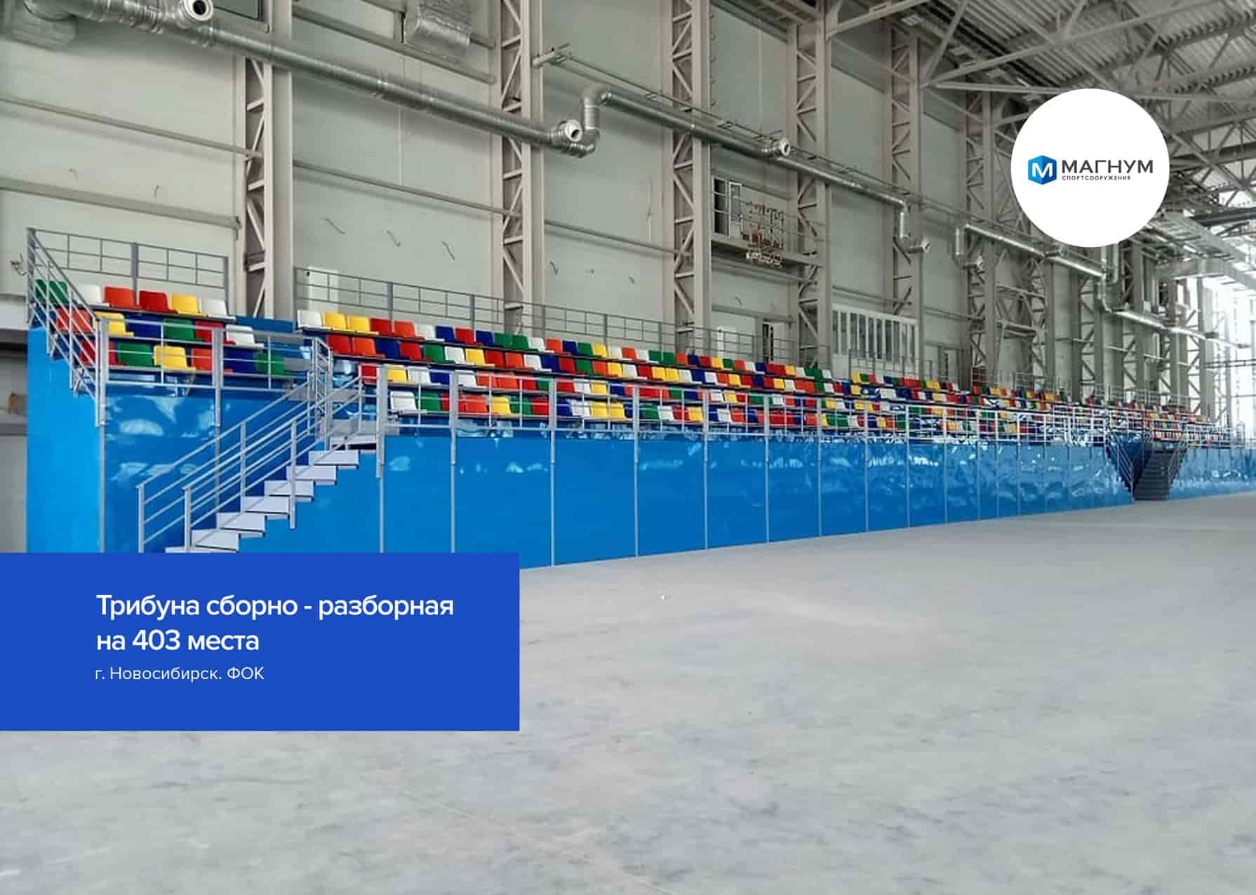 В рамках строительства нового ФОК по ул. Лебедевского в г. Новосибирск, наша компания осуществляла поставку трибуны с подъемом первого ряда и подтрибунным помещением.