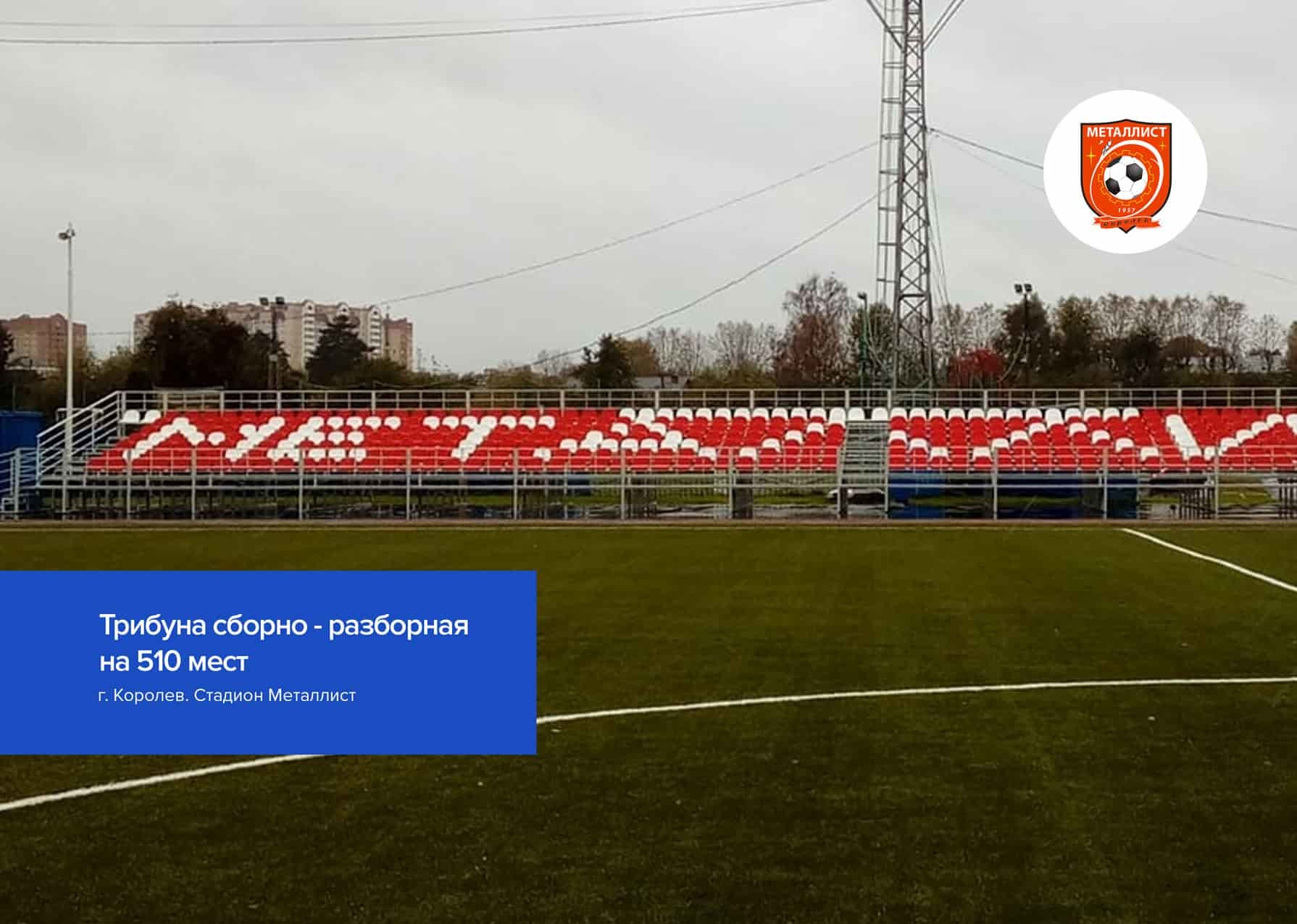 Для реконструкции стадиона "Металлист" была изготовлена 7 рядная трибуна, на которой белыми сиденьями выложено название стадиона. Изначально планировалось разместить наименование города - Королев, но заказчик изменил решение. Результат нашей работы вы можете увидеть по адресу: г. Королев, ул. Орджоникидзе, 6В.